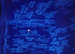When I outgrew the A/4 format, I started to use the planes of the wall as a next step. I brought about a partition of the levels by diminishing of the size of the letters from level to level. Though it was on one plane again, through this I became enriched by the possibility of building a new kind of space. At my exhibit in Kolozsvár, I used a darkened space and UV light in order for the atmosphere of the space to be complete. The text-carpet covering the walls was like an artificial sky made of letters.